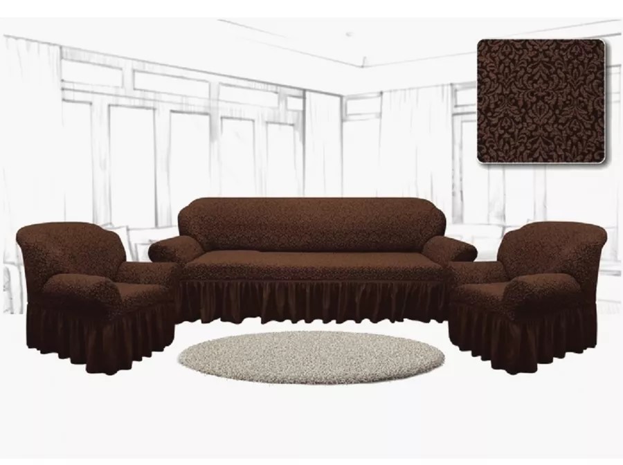 Комплект чехлов на 3-х местный диван и 2 кресла с оборкой Цветы ,шоколадный