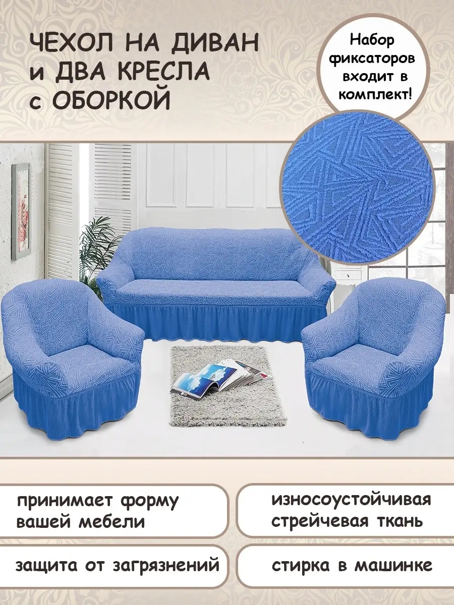 Комплект чехлов на 3-х местный диван и 2 кресла с оборкой Жаккард ,синий