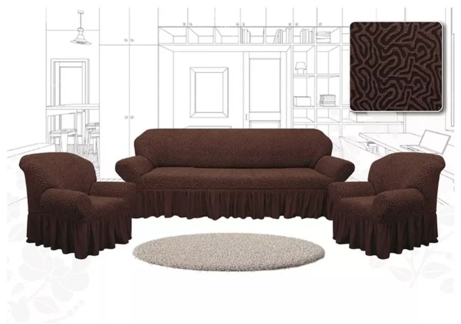 Комплект чехлов на 3-х местный диван и 2 кресла с оборкой Зигзаг ,шоколадный