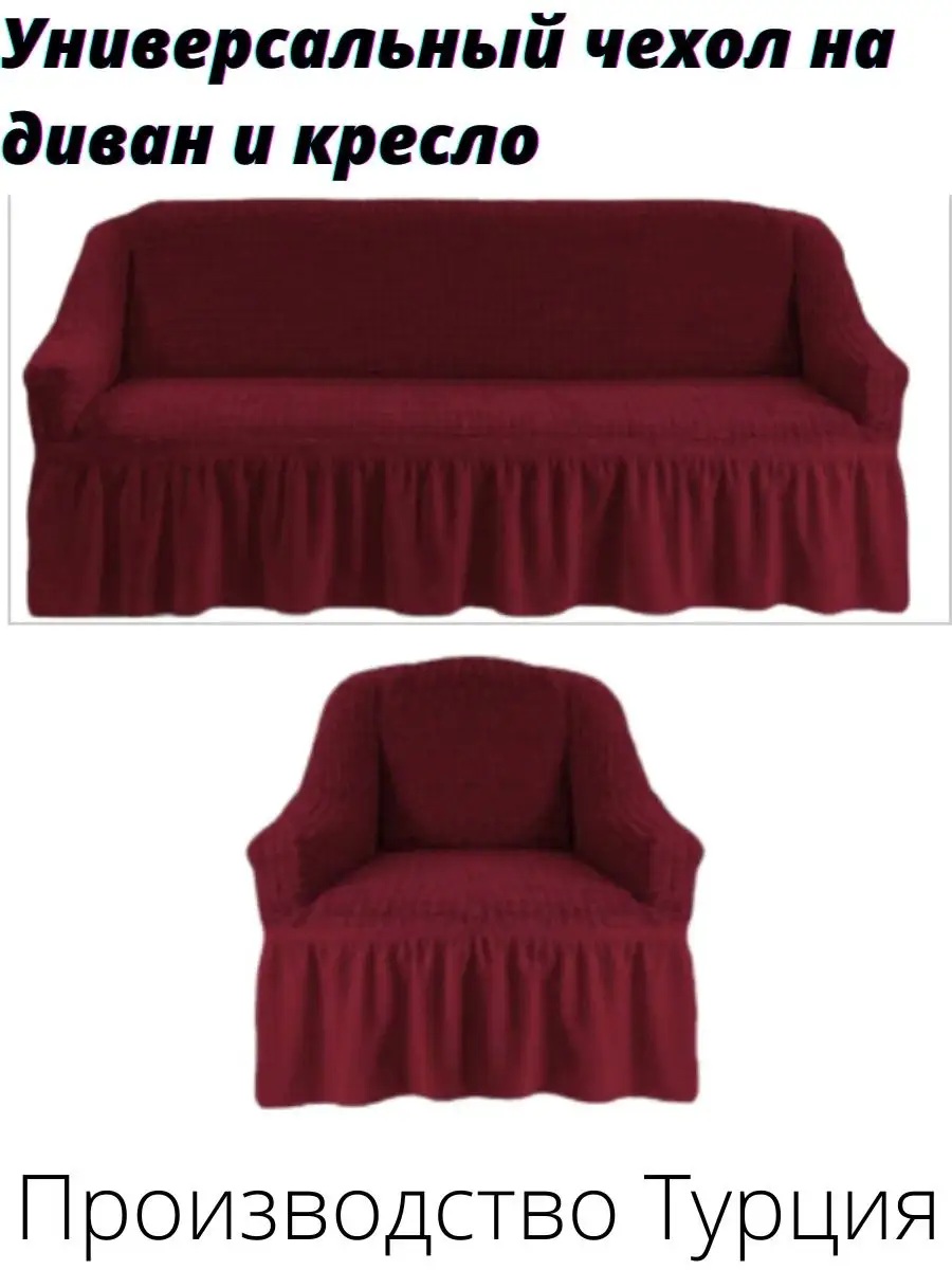 Комплект чехлов на диван и 1 кресло с оборкой, стрейч, бордовый