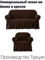 Комплект чехлов на диван и 1 кресло с оборкой, стрейч, шоколадный