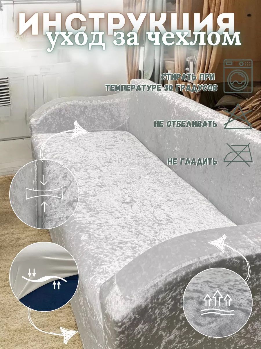 Комплект чехлов на диван и 2 кресла без оборки Королевский велюр ,белый матовый
