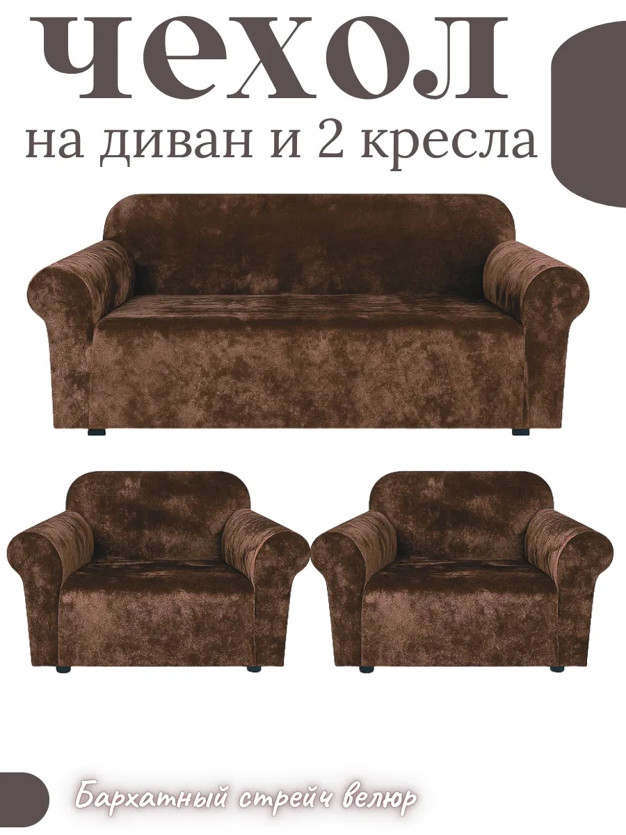 Комплект чехлов на диван и 2 кресла без оборки, велюр, шоколадный трюфель