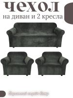 Комплект чехлов на диван и 2 кресла без оборки, велюр, темно-серый