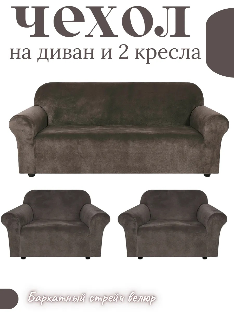 Комплект чехлов на диван и 2 кресла без оборки, велюр, темный горький шоколад