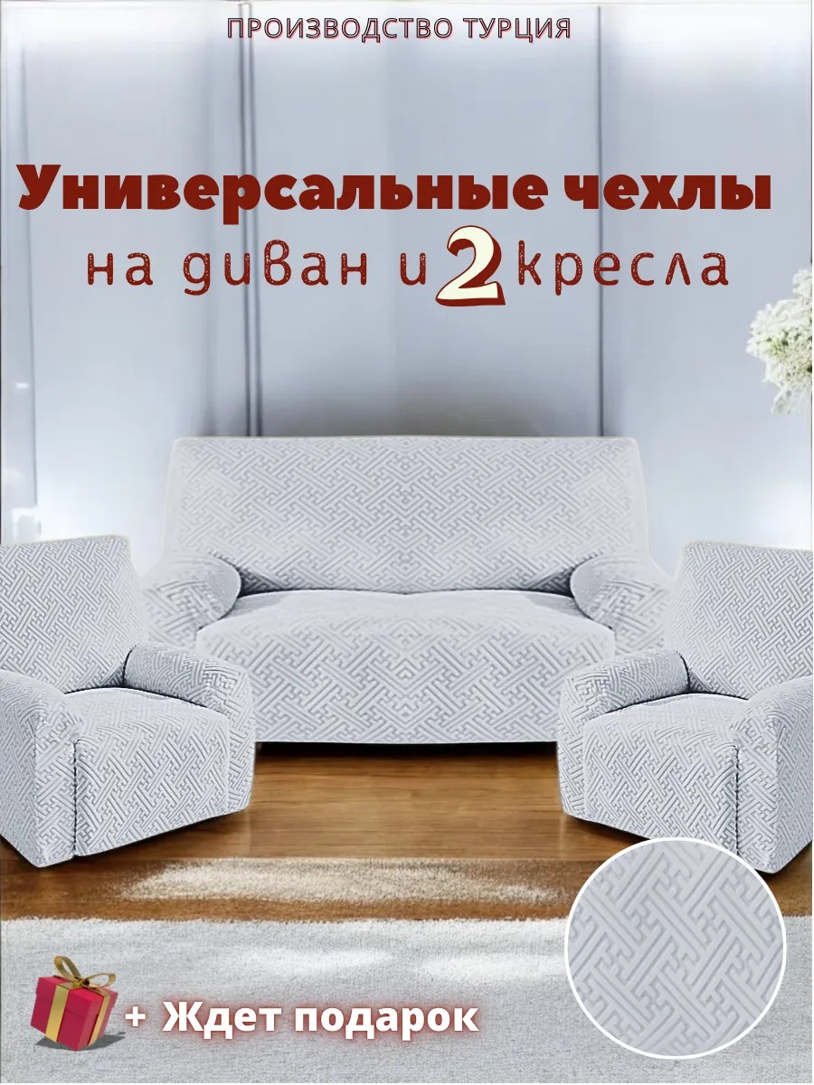 Комплект чехлов на диван и 2 кресла без оборки, жаккард, бело-серый, серый