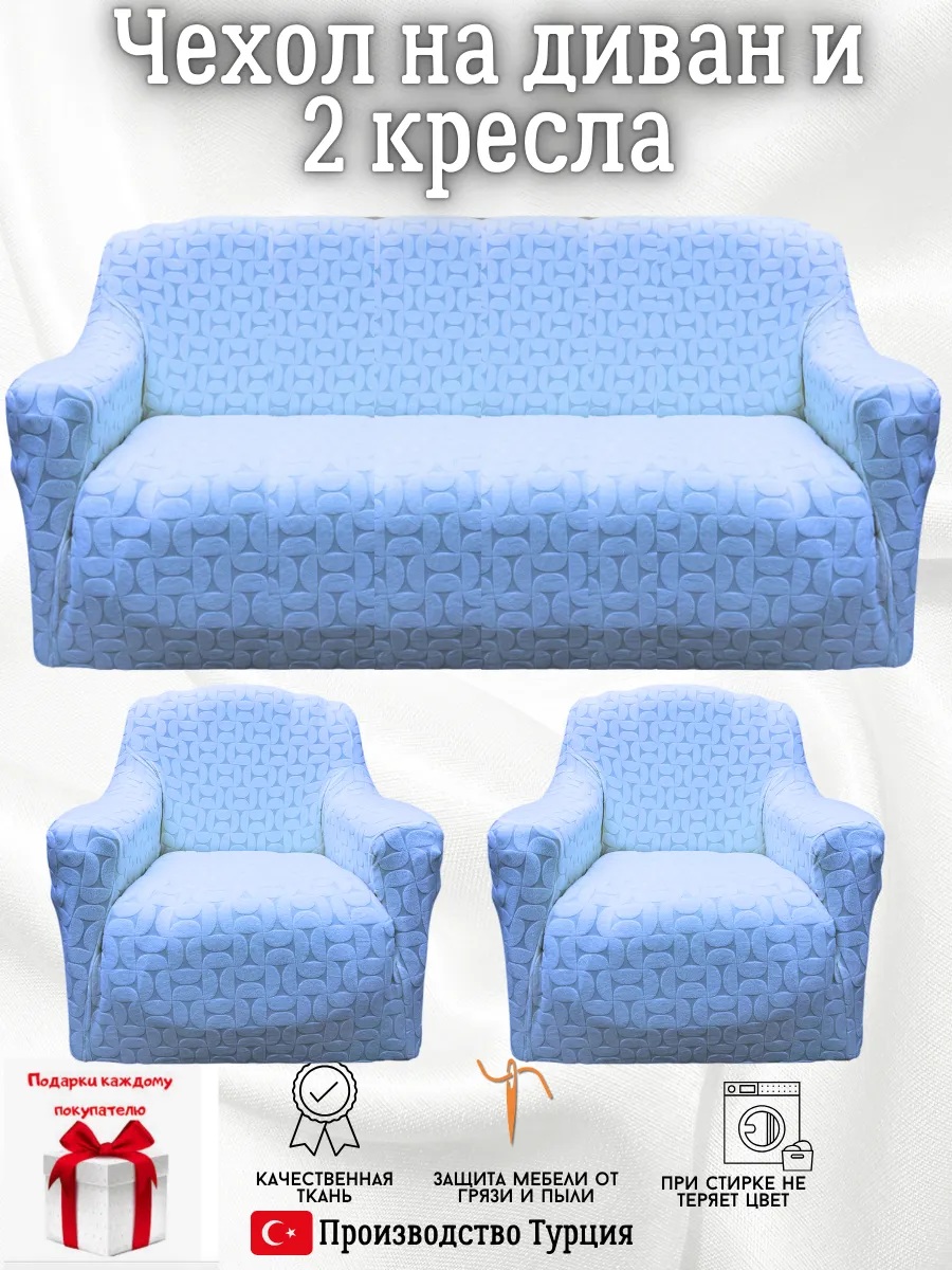 Комплект чехлов на диван и 2 кресла без оборки, жаккард, голубой