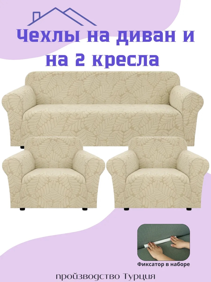 Комплект чехлов на диван и 2 кресла без оборки, жаккард, кремовый, крем-брюле