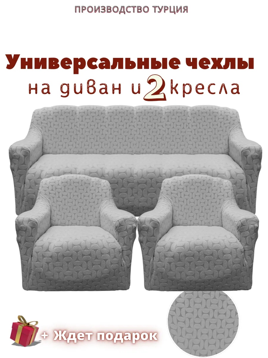 Комплект чехлов на диван и 2 кресла без оборки, жаккард, средне-серый