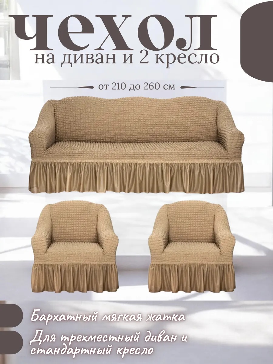 Комплект чехлов на диван и 2 кресла с оборкой, стрейч, медово-бежевый