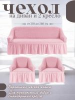 Комплект чехлов на диван и 2 кресла с оборкой, стрейч, розовый
