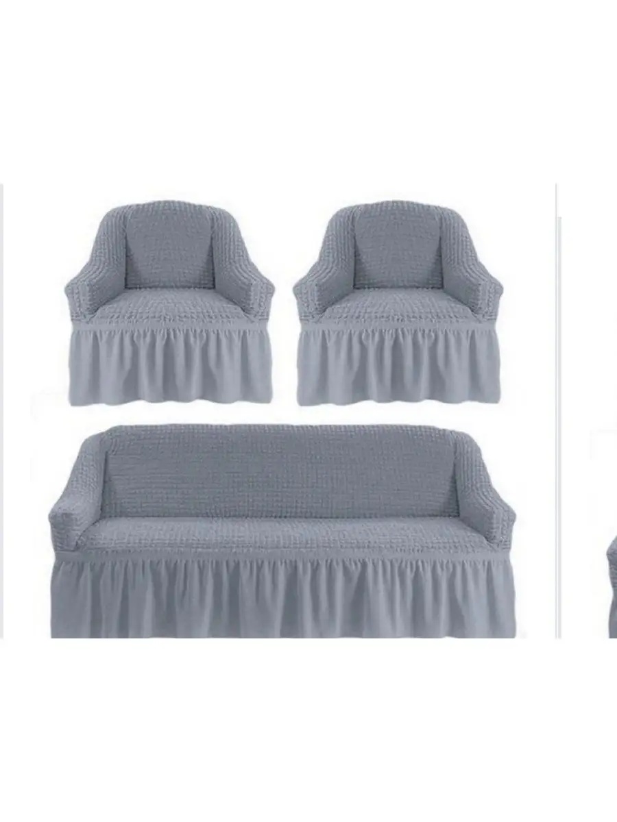 Комплект чехлов на диван и 2 кресла с оборкой, стрейч, серый