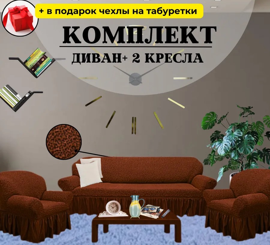 Комплект чехлов на диван и 2 кресла с оборкой, жаккард, шоколадный