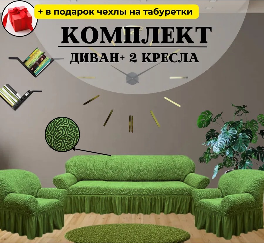 Комплект чехлов на диван и 2 кресла с оборкой, жаккард, зеленый